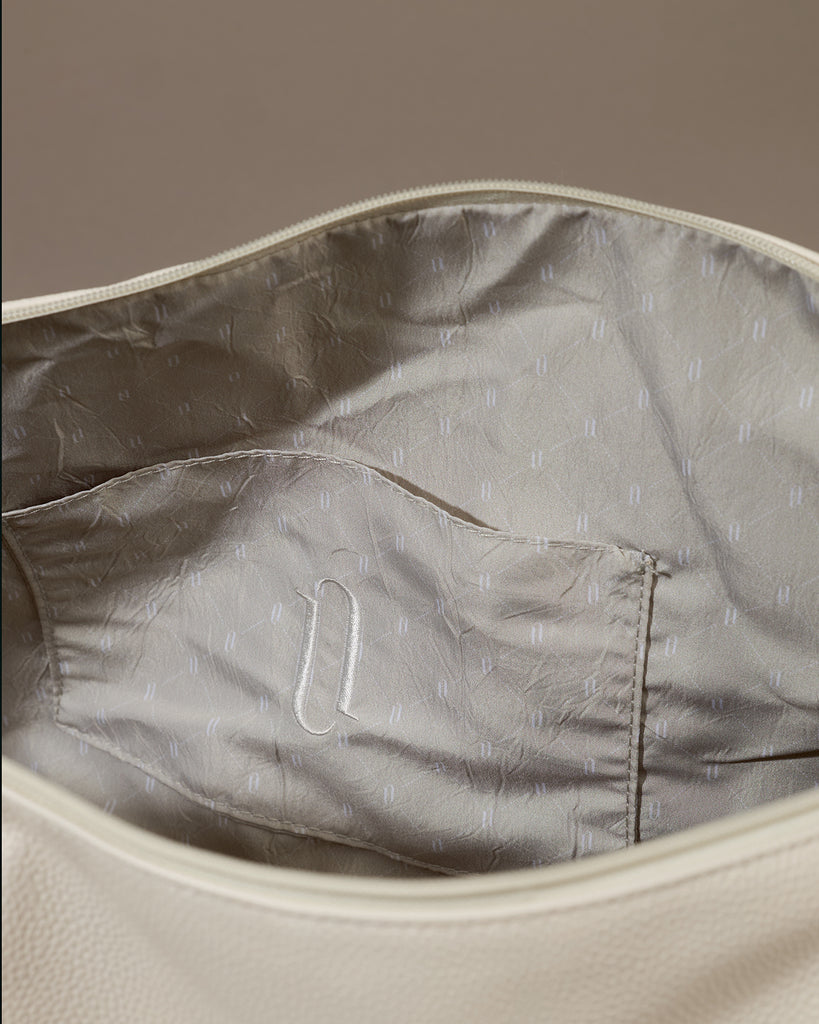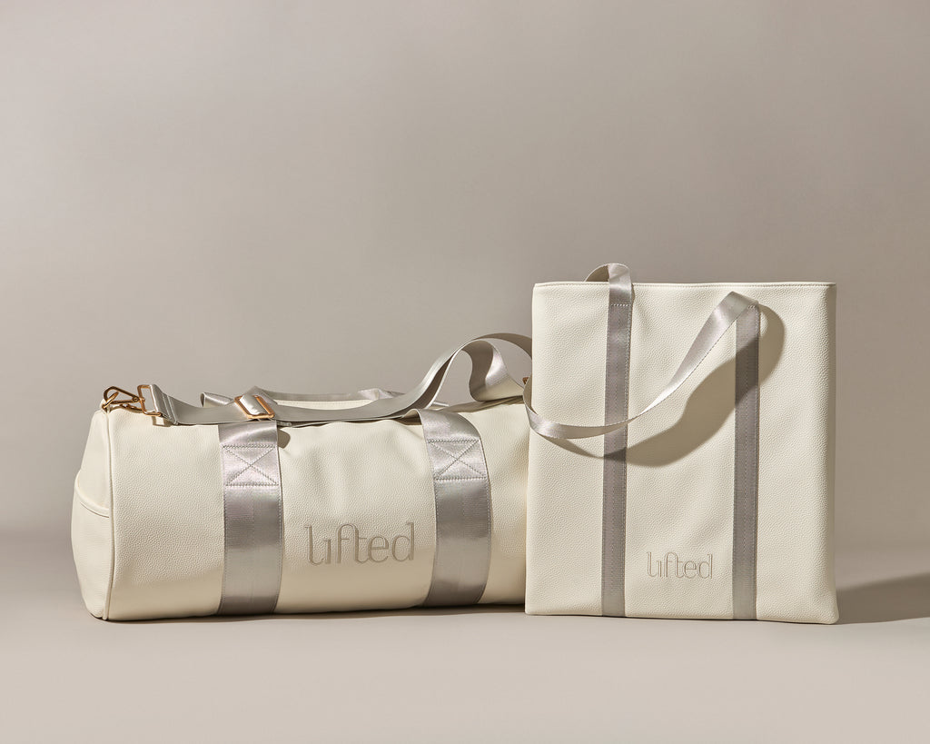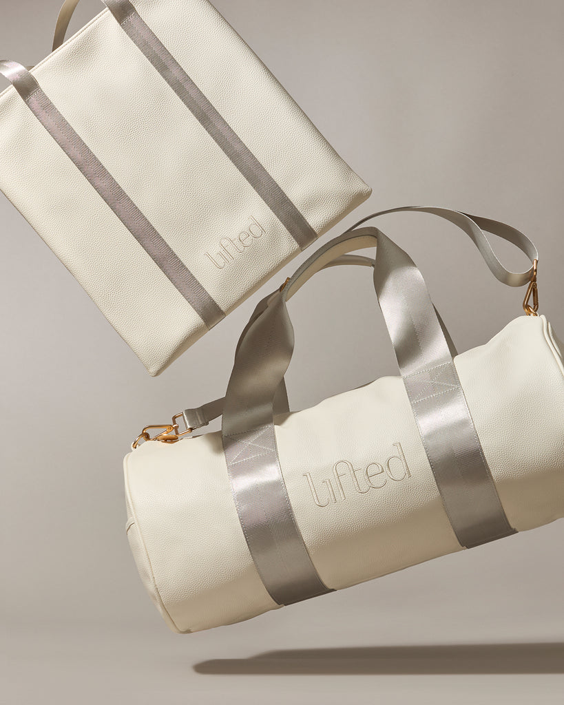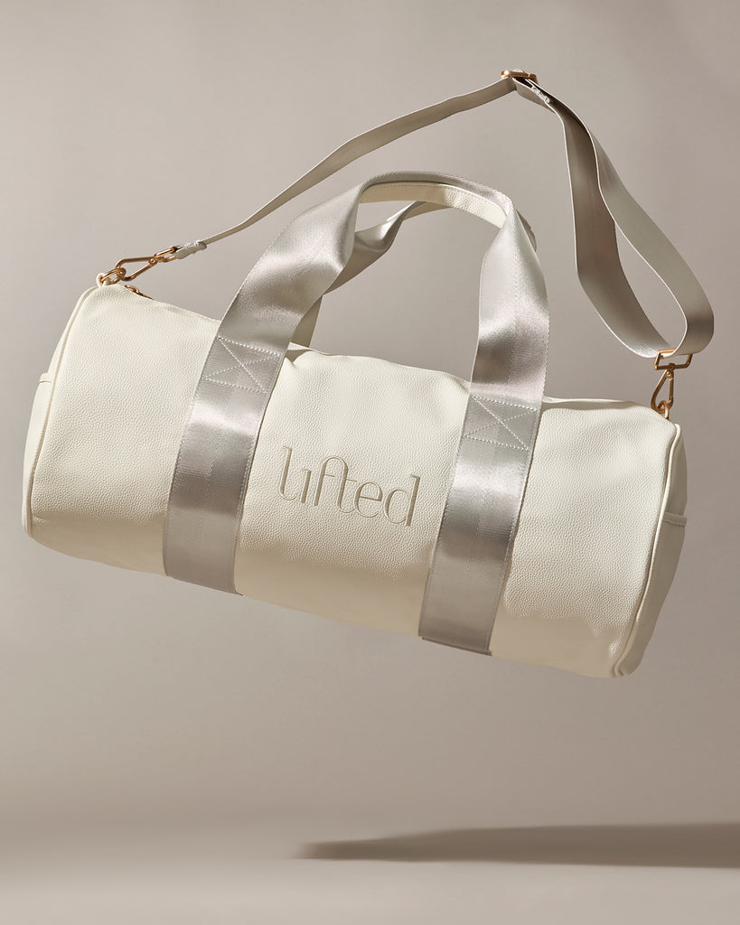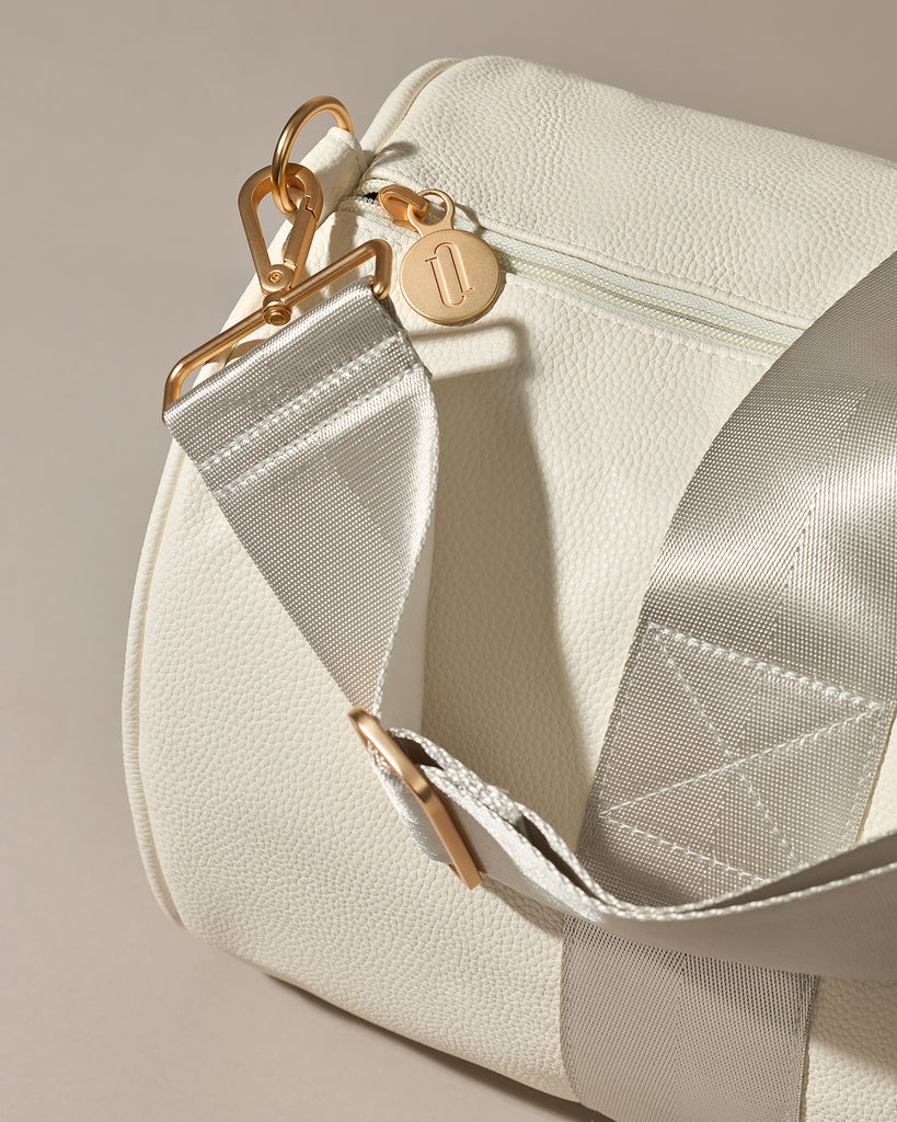 Our On-The-Go-Duffle is crafted from luxurious vegan pebbled leather in soft white, finished with tonal seatbelt-quality straps and accented with premium gold hardware. Spacious enough for your entire routine: sneakers, spare clothes, water bottle, post-workout layers, and all the essentials that make your day.